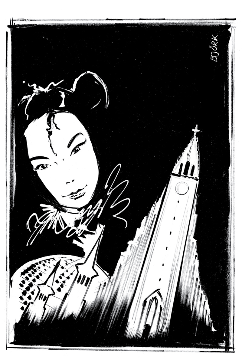 Que je dessine des stars ou des musiciens plus obscurs, je les dessine de la même manière. Pas de hiérarchie, pas de traitement de faveur. C’était l’objectif : placer tout le monde sur un pied d’égalité. Parce que c’est cela, le rock : une égalité radicale entre figures connues et inconnues. Que personne ne se dise : « Pour Bowie ou Björk, il s’est appliqué, alors que pour tel autre non. » Cela voulait dire ne pas jouer sur les proportions, ne pas donner plus d’importance à certains portraits. Le noir et blanc participe de ce choix. C’est une option esthétique, économique également, qui correspond parfaitement à l’esprit rock du projet.