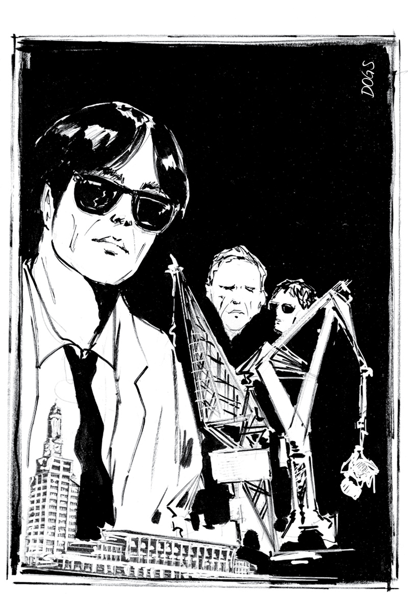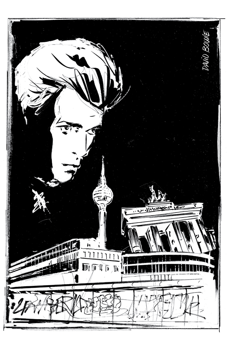 Par un détour assez inattendu, les derniers Jeux Olympiques. Guy Messina, fondateur de GM ÉDITIONS, m’avait sollicité pour le storyboard de la cérémonie d’ouverture. Cinq à six mois intenses à imaginer des séquences, à transformer des idées en images qui allaient défiler sous les yeux du monde entier. Au milieu de cette effervescence, Guy m’évoque ce livre de Jean-Daniel sur les villes qui ont marqué sa carrière de journaliste musical et l’histoire du rock. Je venais juste de finir un dessin de Bowie, période berlinoise. Bonne coïncidence. Je l’envoie aux éditions et ils accrochent de suite. Deux autres dessins suivent, dans le même esprit. Les trois visuels sont présentés à Jean-Daniel. Son enthousiasme scelle l’affaire.