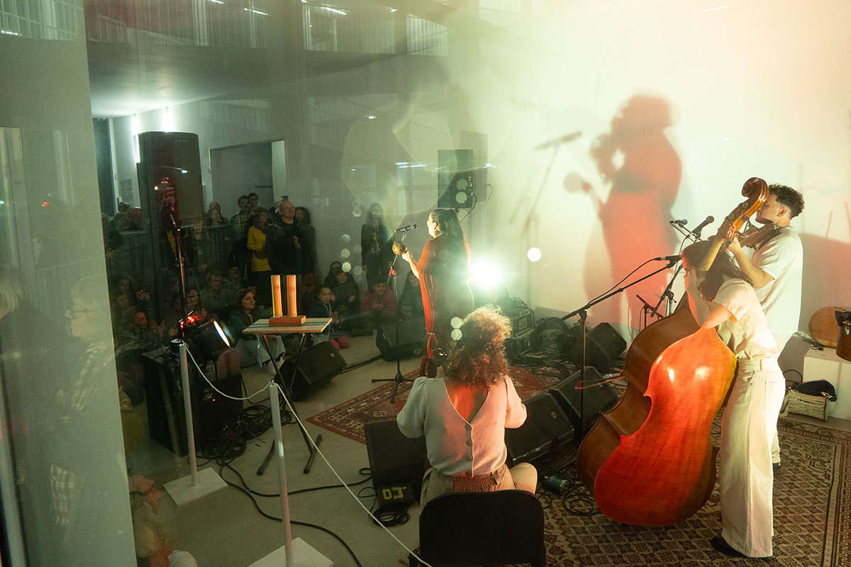 Rebecca Roger Cruz a du coffre. Du genre qui impose son propre tempo aux ensembles, aux gens, aux astres. Ici, au Consortium, elle installe un mini-temple : scénographie calquée sur celle d’une cérémonie religieuse, chœurs et cordes derrière la prêtresse en robe de feu. Après le Soleil d’hiver qui éclairait Grégory Dargent, la veille, la lumière du jour est celle du crépuscule qui nous brûle par les prêches de cette voix. Les cantiques de la native de Caracas nous baladent des mers, peintes par le trio violon-violoncelle-contrebasse jusqu’aux tristesses des âmes délogées par un face-à-face batterie-percussions. Exil, diaspora et ce qu’il reste de synonymes dans toute notre palette d’émotions face à cette musique vibrante. Le Consortium abrite une caravane de pèlerins, tremblant autour d’un feu païen où les dodelinements du public face à un orchestre de fidèles et aux traits vocaux intenses pourraient faire vaciller, à tout moment, cette embarcation précaire. Musicien·nes et auditeurices dans le même camp, suivant aveuglément la prophète habitée qui chante, crie, frappe et virevolte. Et le public de suivre à son tour, sa messie du jour. (llt)